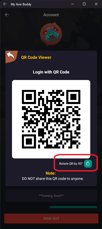 Solution 2 : Using My Axie Buddy QR Code rotate button function try to rotate the QR Code and try to scan it again.